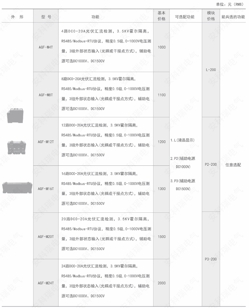 AGF-T穿孔式光伏匯流采集裝置是專門(mén)應(yīng)用于智能光伏匯流箱,用于監(jiān)測(cè)光電池陣列中電池板運(yùn)行狀態(tài),組串電流測(cè)量,匯流箱中防雷器狀態(tài)采集、直流斷路器狀態(tài)采集、裝置帶有RS485接口可以把測(cè)量和采集到的數(shù)據(jù)和設(shè)備狀態(tài)上傳。