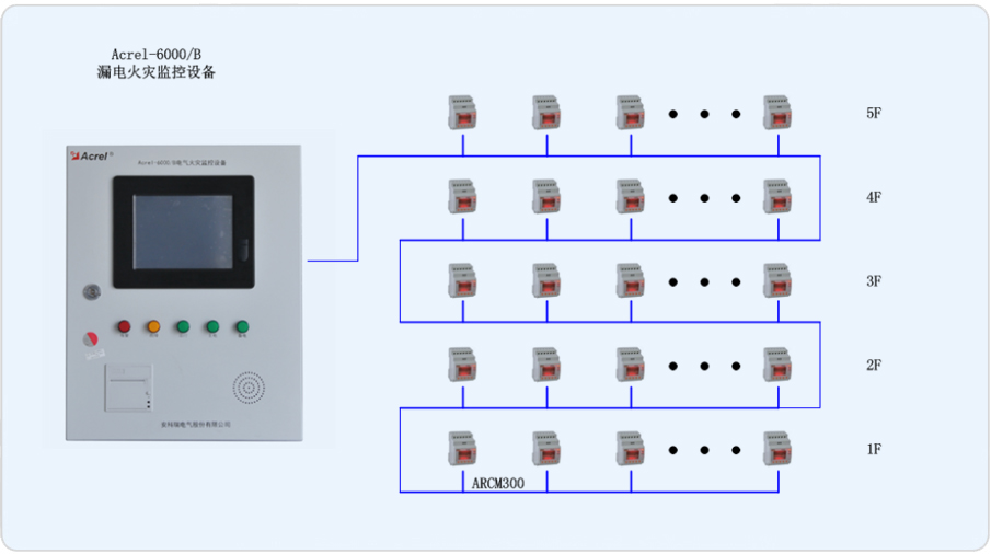 系統(tǒng)組網(wǎng)共分為站控管理層、網(wǎng)絡(luò)通訊層、現(xiàn)場設(shè)備層三層,該項目通訊總線共接入一條通訊總線,總線在樓層配電箱手拉手串接后,接入壁掛式后臺,組成電氣火災(zāi)系統(tǒng)的大動脈。箱體中漏電流互感器通過電流線接入漏電探測器,漏電探測器實時顯示漏電情況,組成一套信號穩(wěn)定,精度可靠的電氣火災(zāi)監(jiān)測系統(tǒng)。