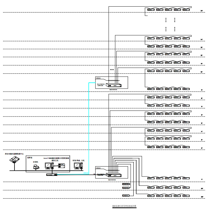 辦公主樓地上二十二層,地下兩層,合計102塊西安旌旗電子的直接接入型電能表,6塊安科瑞電氣的PZ96L-E4電能表,32塊安科瑞電氣的PZ72L-E4電能表,1塊RS485接口Modbus通訊協議的水表需要進行能耗監測。后臺位于一層的值班室內,因此針對本項目的性質,設計一套能耗系統,并在值班室內操作臺處配置一臺通訊管理機,對地下配電室的安科瑞電表、遠傳水表以及裙樓及辦公樓低層的西安旌旗電子電能表進行采集。同時在9層弱電間再設置一臺內置通訊管理機的數據采集箱,對高層部分的西安旌旗電子電能表進行采集,從9層采集箱至1層值班室操作臺處后臺主機通過光纖進行數據傳輸。電表及水表的數據采集后按照能耗分類分項原則進行分析,同時根據西安市公共建筑能耗監測系統技術規范DBJ61/T 97-2015將數據上傳至西安市公共建筑能耗監測平臺。