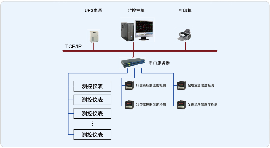 系統(tǒng)主要實現(xiàn)中國建設銀行股份有限公司云南分行本部地下B2變電所的0.4kV配電系統(tǒng)進行用電監(jiān)測與電能管理;監(jiān)測范圍為改造變電所的T1、T2變壓器的饋線柜、母聯(lián)柜、電容補償柜,變壓器的相間溫度、配電室和發(fā)電機房的溫濕度,饋線柜和母聯(lián)柜側儀表進行遠程實時監(jiān)控和電能管理。該系統(tǒng)總計有29只儀表,分4條總線,都是直接通過屏蔽雙絞線走管道拉至值班室后連接到串口服務器上,實現(xiàn)總線上儀表與監(jiān)控主機的數(shù)據(jù)連通。