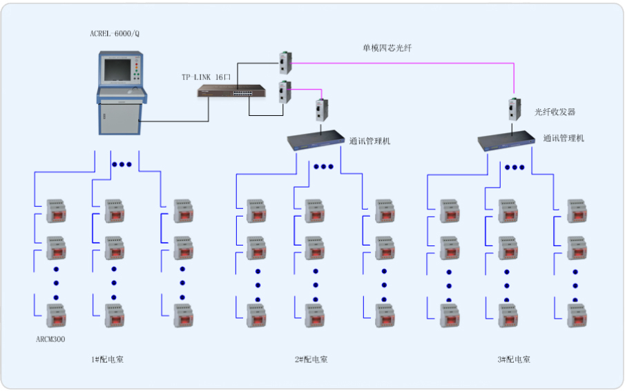 系統組網共分為站控管理層、網絡通訊層、現場設備層三層,該項目通訊總線共接入20條通訊總線,總線在樓層配電箱手拉手串接后,接入Acrel-6000/Q電氣火災監控設備,組成電氣火災系統的大動脈。箱體中漏電流互感器通過電流線接入漏電探測器,漏電探測器實時顯示漏電情況,組成一套信號穩定,精度可靠的電氣火災監測系統?,F場共有449只ARCM系列電氣火災探測器模塊。