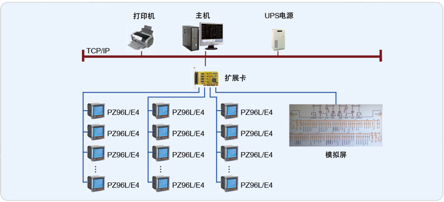 Acrel-2000電力監控主要實現北京電氣工程學校變電所的0.4kV配電系統的用電監測與模擬屏的實時監控;監測范圍為變電所的T1、T2變壓器的低壓進線柜、聯絡柜、饋線柜中的智能電力儀表和模擬屏,從而實現遠程實時監測和模擬屏的實時監控。該系統總計有61只儀表(其中全部為PZ系列智能儀表)和一個模擬屏,分4條總線,由于變電所與值班室距離較近,采用變電所內自行組網,然后通過擴展卡直接接至電腦,實現該現場總線上儀表、模擬屏與監控主機的數據連通。