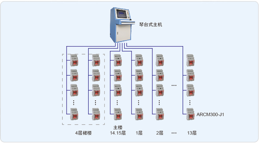 現(xiàn)場(chǎng)共有ARCM300-J1剩余電流式儀表280只,分別分布于15層主樓和4層裙樓樓層內(nèi),現(xiàn)場(chǎng)火災(zāi)探測(cè)器采用總線方式接至位于主樓1層消防控制室內(nèi)的 Acrel-6000琴臺(tái)式電氣火災(zāi)監(jiān)控系統(tǒng)。