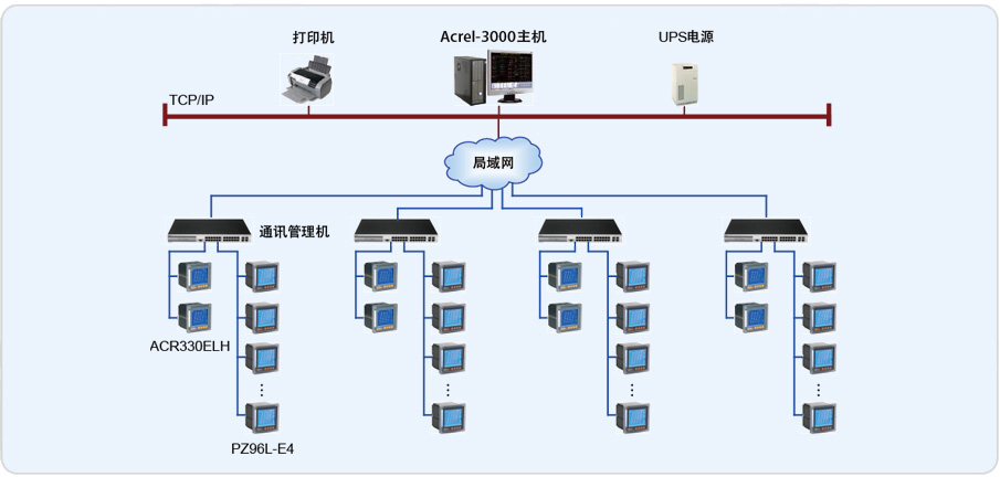 該系統(tǒng)總計有79只儀表(其中包括8只ACR330ELH諧波儀表,71只PZ系列智能儀表),分8條總線,由于四個變電所之間距離較遠(yuǎn),并且較為分散,采用每個變電所內(nèi)自行組網(wǎng),然后并入惠氏公司內(nèi)部局域網(wǎng)的方式,實該現(xiàn)場總線上儀表與監(jiān)控主機(jī)的數(shù)據(jù)連通。