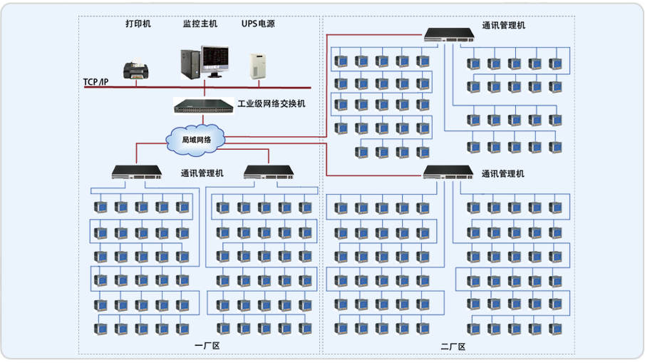 系統通過安裝在工廠電網中主要受電點和樞紐配電柜中的電能監測儀表采集到配電網的各項電力參數信號,再將信號轉換為數據傳輸到計算機中,計算機對數據進行存儲、計算和分類存儲到數據庫中,然后通過計算軟件將電能以報表、圖表的形式進行展示。