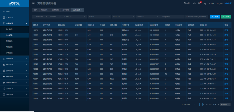 | 遠程充電樁電能管理系統 | Acrel-9000 | (一)資源管理 充電站檔案管理,充電樁檔案管理,用戶檔案管理,充電樁異常交易監測 (二)交易結算 充電價格策略管理,預收費管理,賬單管理,營收和財務相關報表 (三)用戶管理 用戶注冊,用戶登錄,用戶帳戶管理 (四)充電服務 充電設施搜索,充電設施查看,地圖尋址,在線自助支付充電,充電結算,導航等 (五)微信小程序 掃碼充電,賬單查詢、充電信息監測等功能 (六)數據服務 數據采集,數據存儲和解析 (七)收益隔天結轉到帳 |