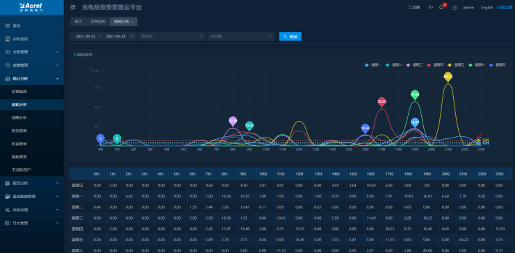 可查看指定時段充電站和充電樁的用電量,顯示對應的能耗趨勢圖并進行同環比分析。
