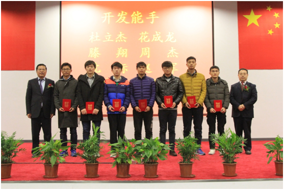 圖為董事長周中先生、副總經(jīng)理姜龍先生為開發(fā)能手頒獎