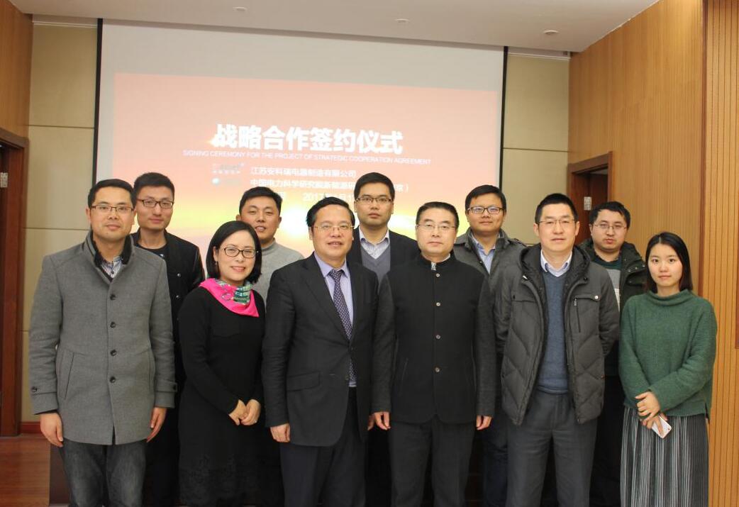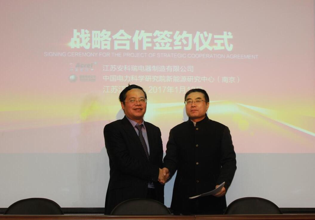 2017年1月13日下午,江蘇安科瑞電器制造有限公司和中國電科院新能源研究中心合作項目的簽約儀式,在江蘇安科瑞電器制造有限公司隆重舉行。參加此次簽約雙方代表有:安科瑞董事長/總經理周中、副總經理朱芳、副總經理宗壽松、副總經理楊廣亮;中國電科院新能源研究中心副主任丁杰、南京分院綜合管理中心主任吳福保、新能源研究中心儲能應用室主任楊波。此次簽約標志著雙方就微電網集成、儲能變流器(PCS)及系統集成、同步電動機啟動變頻器、移動式電池儲能應急發電車等產品的技術研發、生產、銷售、服務等多方面的合作達成一致,建立了穩固的合作伙伴關系。