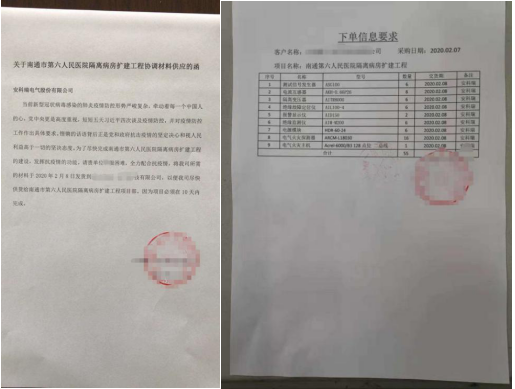 2月7日,安科瑞接到南通市第六人民醫院隔離病房擴建工程協調材料供應函,要求在2月8日下午貨到南通。