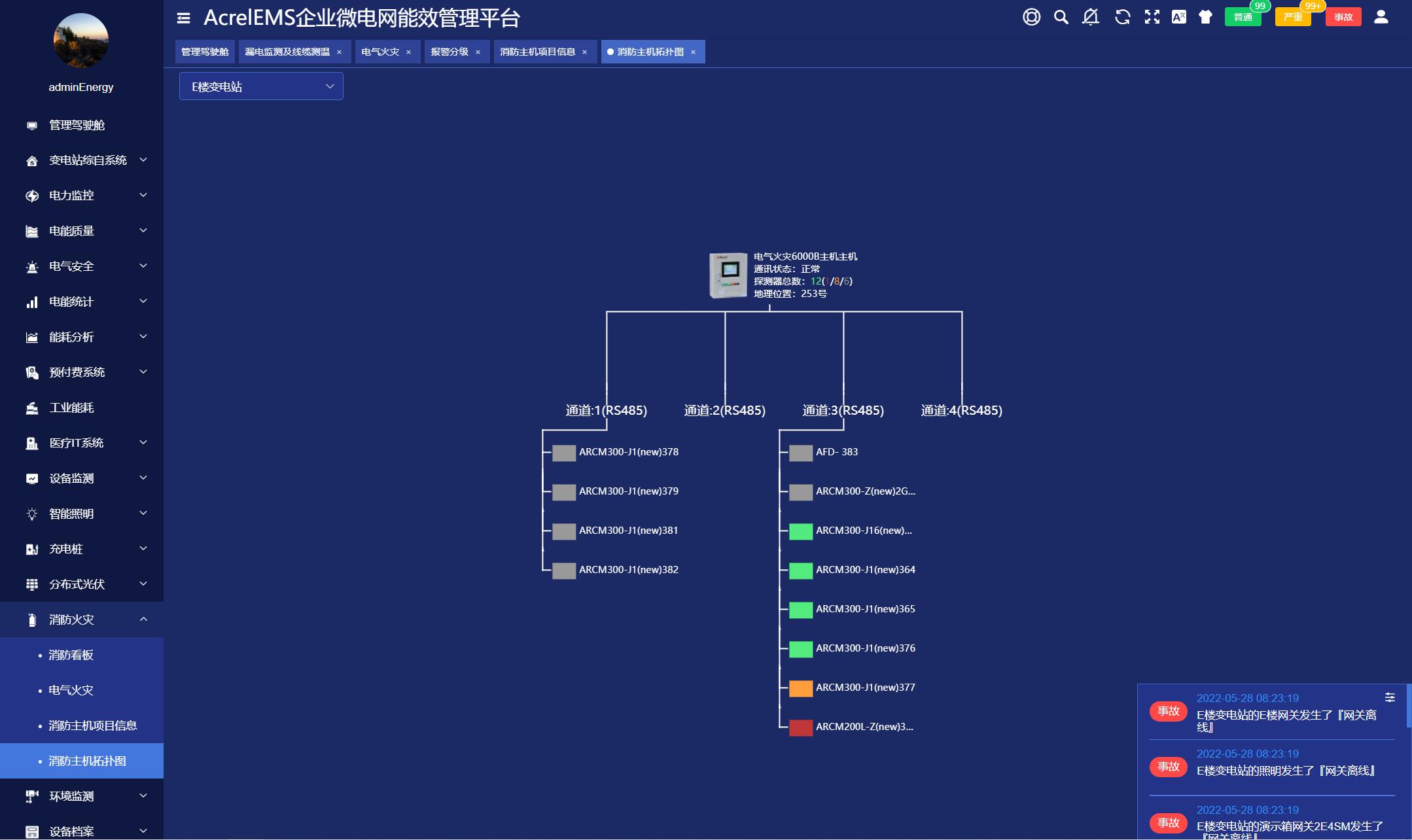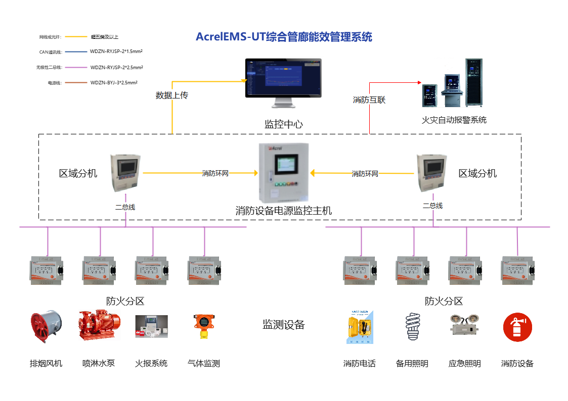 消防設備電源監控系統作為火災自動報警系統的預警子系統,由消防設備電源監控主機、區域分機、消防電源監控模塊組成,通過現場消防環網和消防二總線構成一套完整的對消防設備電源工作狀態實時監視的系統,數據可集成至管廊的AcrelEMS-UT能效管理系統并提供預警信號。