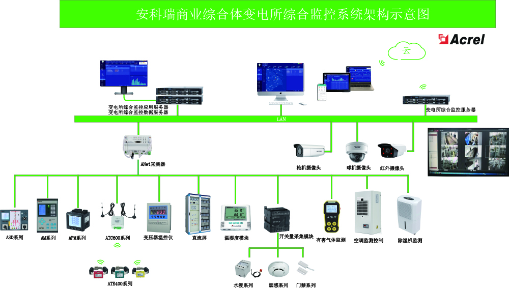 Acrel-2000E配電室綜合監控系統,可實現開關柜運行監控、高壓開關柜帶電顯示、母線及電纜測溫監測、環境溫濕度監測、有害氣體監測、安防監控,可對燈光、風機、除濕機、空調控制等設備進行聯動控制。實現動力環境各數據的檢測與設備控制,優化動力環境,避免運行環境的失控導致配電設備運行故障,保證維護人員安全,延長設備使用壽命,實現配電動力環境的分布式遠程管理。