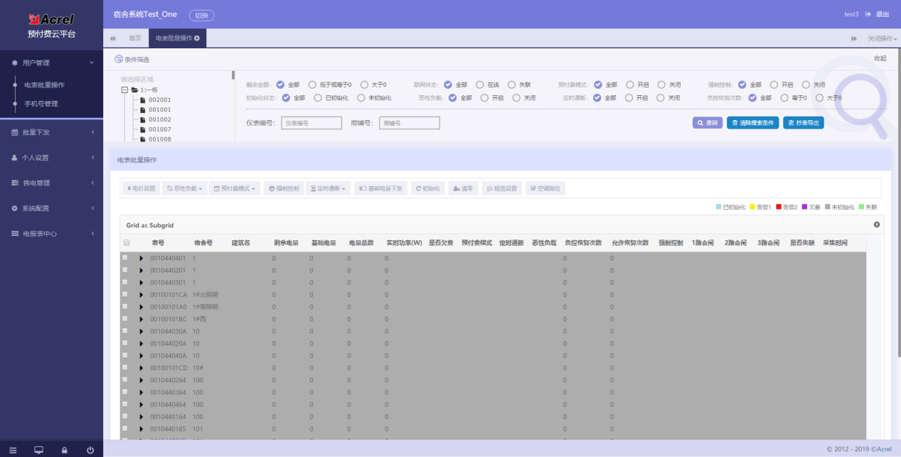 該功能提供電能表批量通斷電、設置下發、狀態篩選、下發和查詢操作。可對指定的某戶或多戶同時進行“電價設置”、“惡性負載”、“預付費模式”、“強制控制”、“定時通斷”、“基礎電量下發”、“初始化”、“清零”、“短信設置”、“空調復位”等操作。