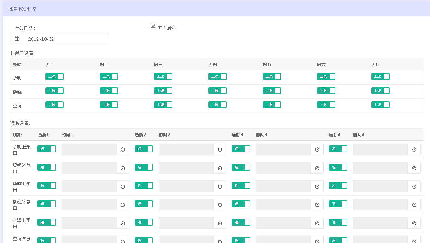 設置工作日和節假日宿舍每天用電通斷時間,最多支持八個時間段,三路可以單獨設置。