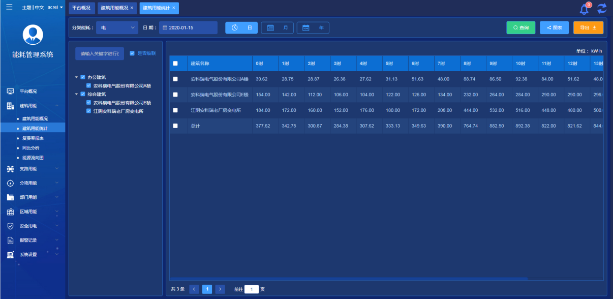統(tǒng)計(jì)當(dāng)前賬號(hào)下所有建筑日、月、年用能統(tǒng)計(jì)報(bào)表,可選擇以報(bào)表或者圖表方式顯示,可導(dǎo)出excel表格形式保存。