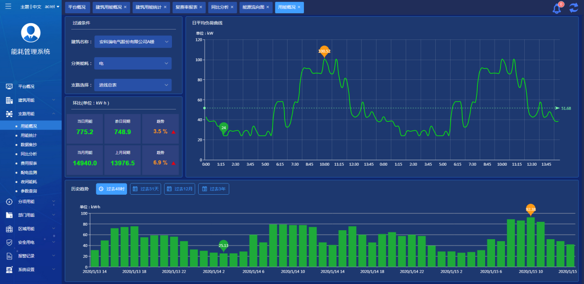可選擇查看具體某個(gè)回路的能源消耗趨勢(shì),包括日均負(fù)荷曲線展示、日月用能對(duì)比數(shù)據(jù)、過去48小時(shí)、過去31天、過去12個(gè)月、過去3年的能源消耗數(shù)據(jù)。
