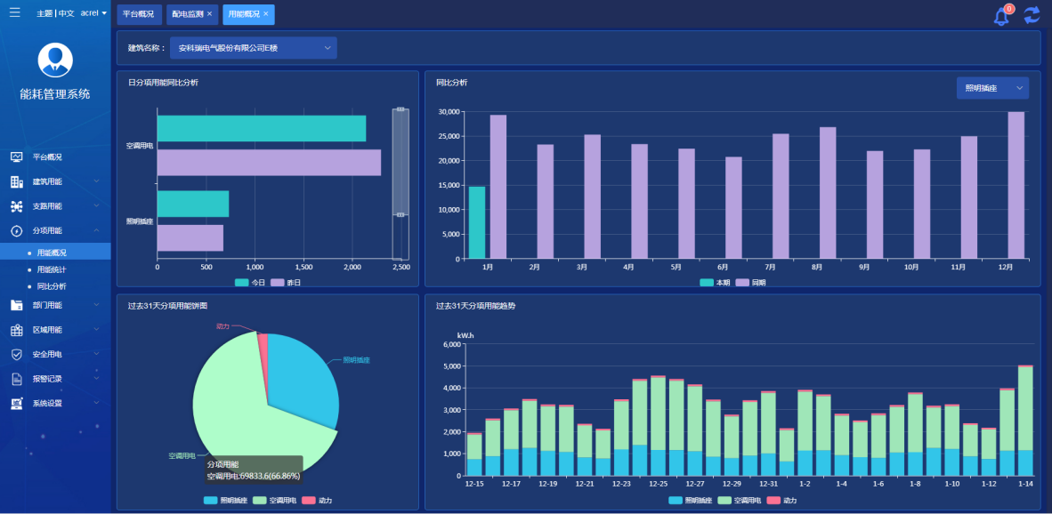 展示當(dāng)前建筑的照明插座、空調(diào)、動(dòng)力和特殊用電,通過餅圖、柱狀圖顯示能源占比、同比對(duì)比以及分項(xiàng)用能趨勢(shì)。
