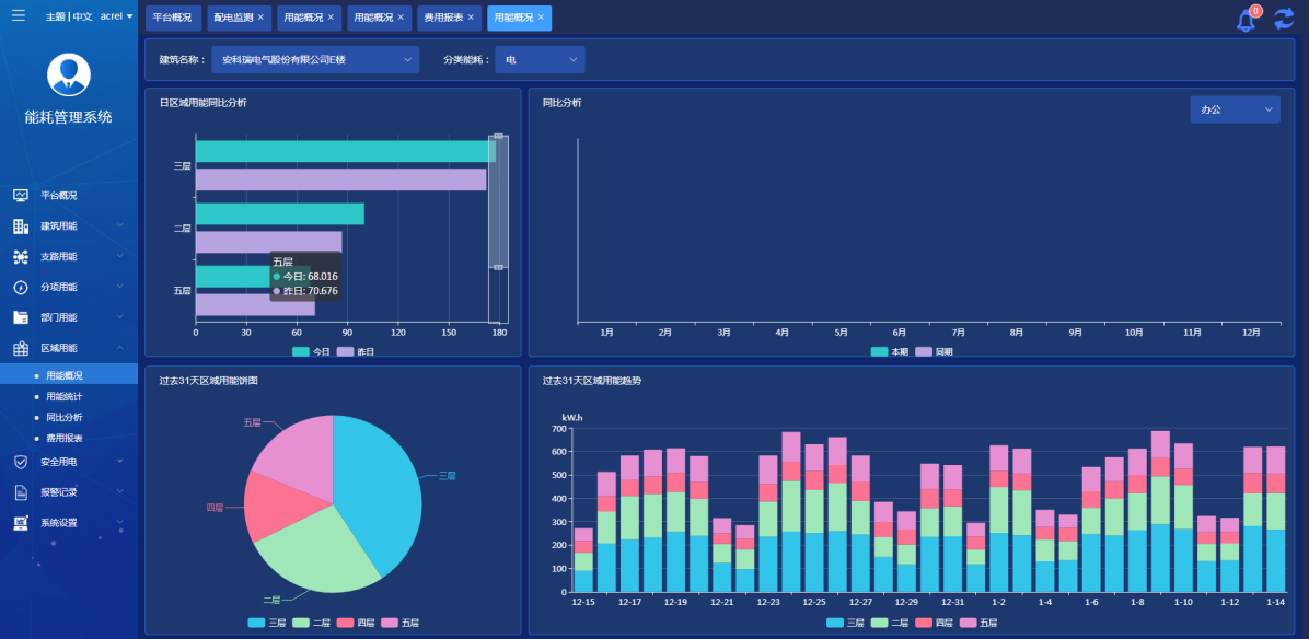 展示當(dāng)前建筑各區(qū)域的用能情況,通過餅圖、柱狀圖顯示能源占比、同比對(duì)比以及分項(xiàng)用能趨勢(shì),可按照樓、樓層等方式區(qū)分。