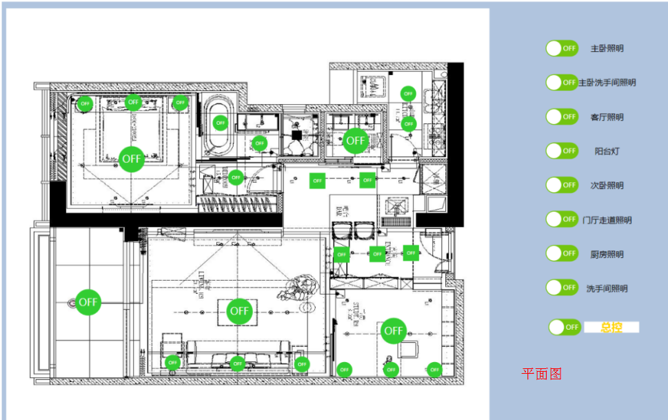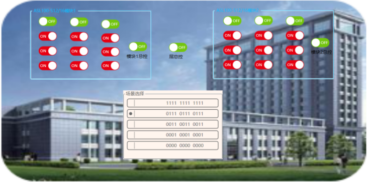 可以通過電腦或者觸控終端控制一棟樓、某一層或某個(gè)區(qū)域所有照明燈具開關(guān)。可以對(duì)單個(gè)照明回路實(shí)現(xiàn)開關(guān)控制,還可對(duì)每個(gè)模塊、箱子、樓層、自定義分區(qū)實(shí)現(xiàn)總控?,F(xiàn)場(chǎng)受控回路的開關(guān)狀態(tài)會(huì)實(shí)時(shí)反饋。