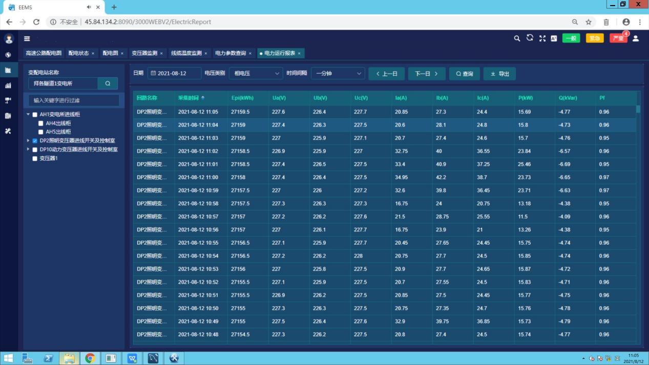 查詢各回路或設備指定時間的運行參數,報表中顯示電參量信息應包括:各相電流、三相電壓、總功率因數、總有功功率、總無功功率、正向有功電能等.