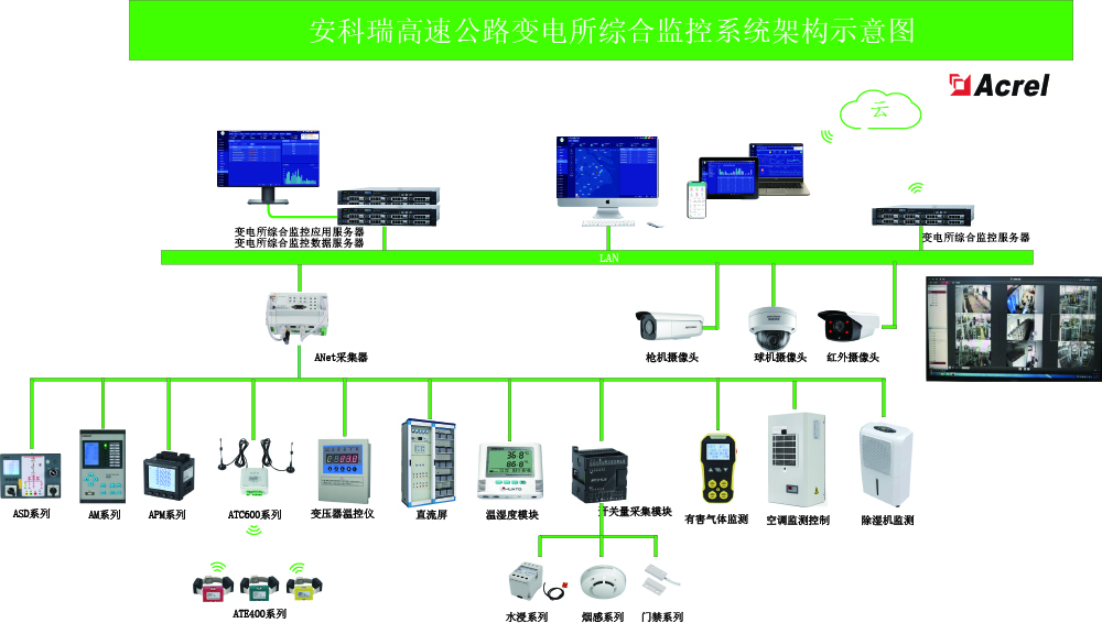 Acrel-2000E配電室綜合監控系統,可實現開關柜運行監控、高壓開關柜帶電顯示、母線及電纜測溫監測、環境溫濕度監測、有害氣體監測、安防監控,可對燈光、風機、除濕機、空調控制等設備進行聯動控制。實現動力環境各數據的檢測與設備控制,優化動力環境,避免運行環境的失控導致配電設備運行故障,保證維護人員安全,延長設備使用壽命,實現配電動力環境的分布式遠程管理。